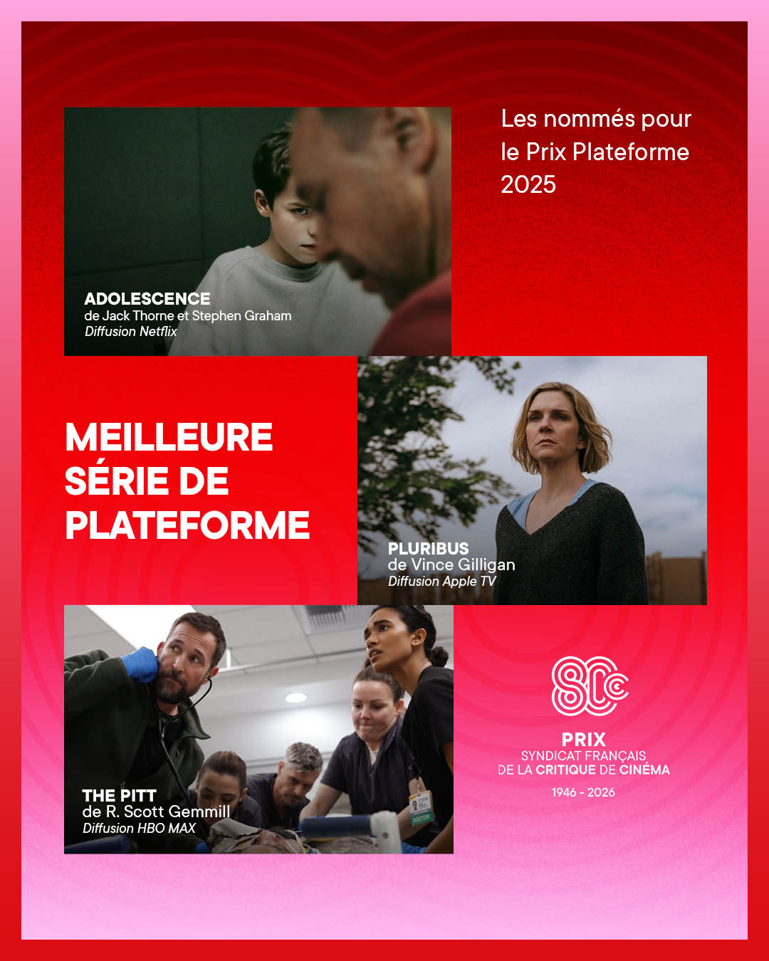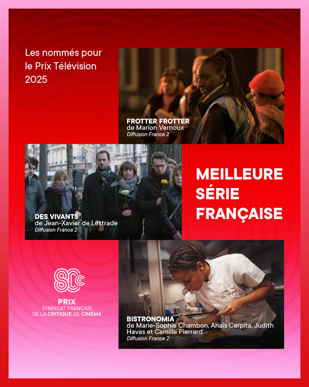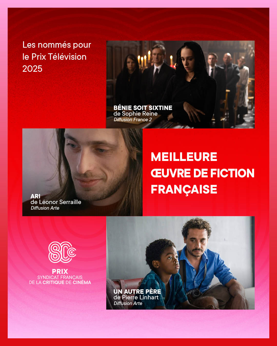 Chaque année, les Prix du Syndicat Français de la Critique de Cinéma et des films de Télévision récompensent le meilleur des ouvrages littéraires et DVDs de cinéma ainsi que les meilleures productions télévisuelles et cinématographiques de l’année.