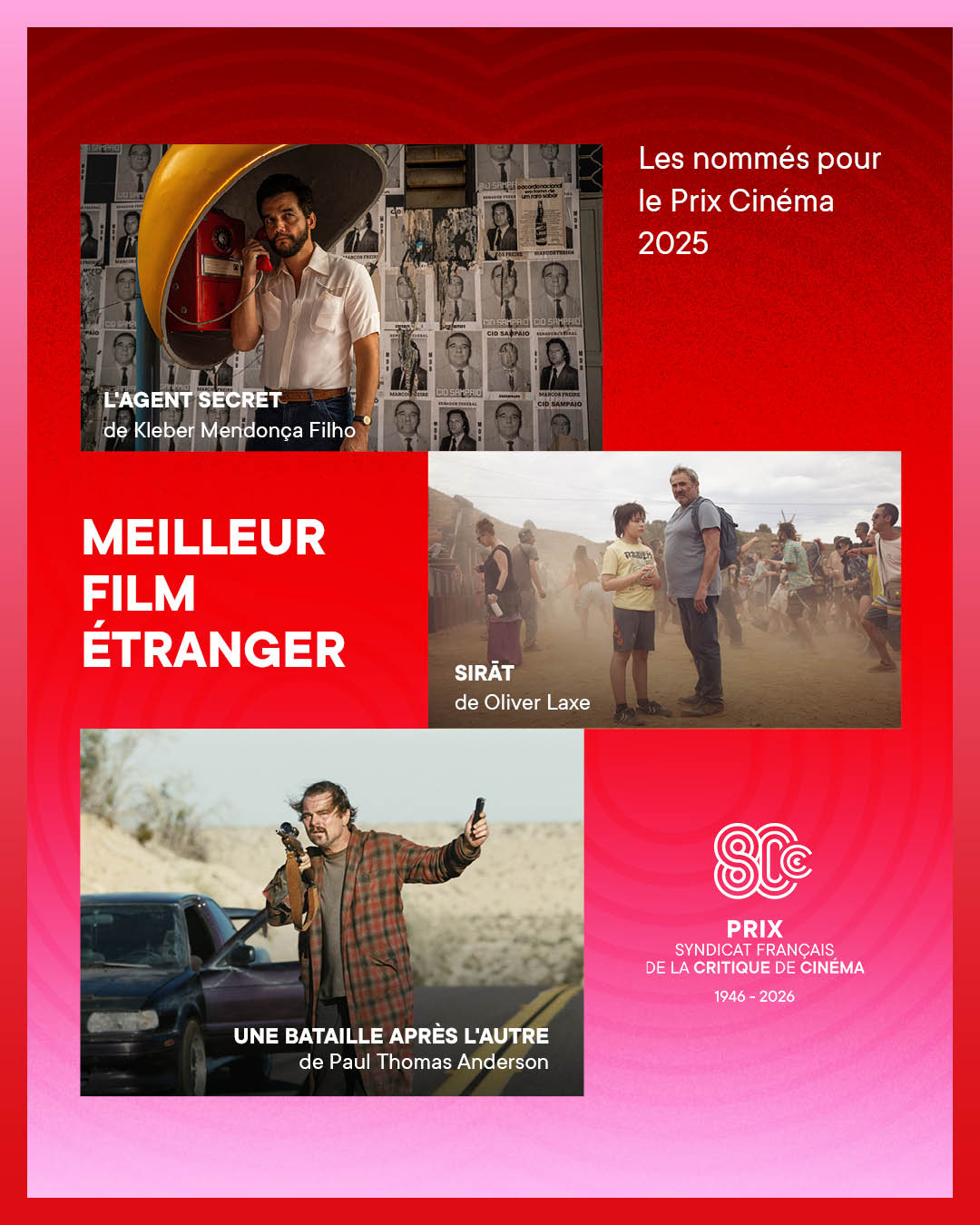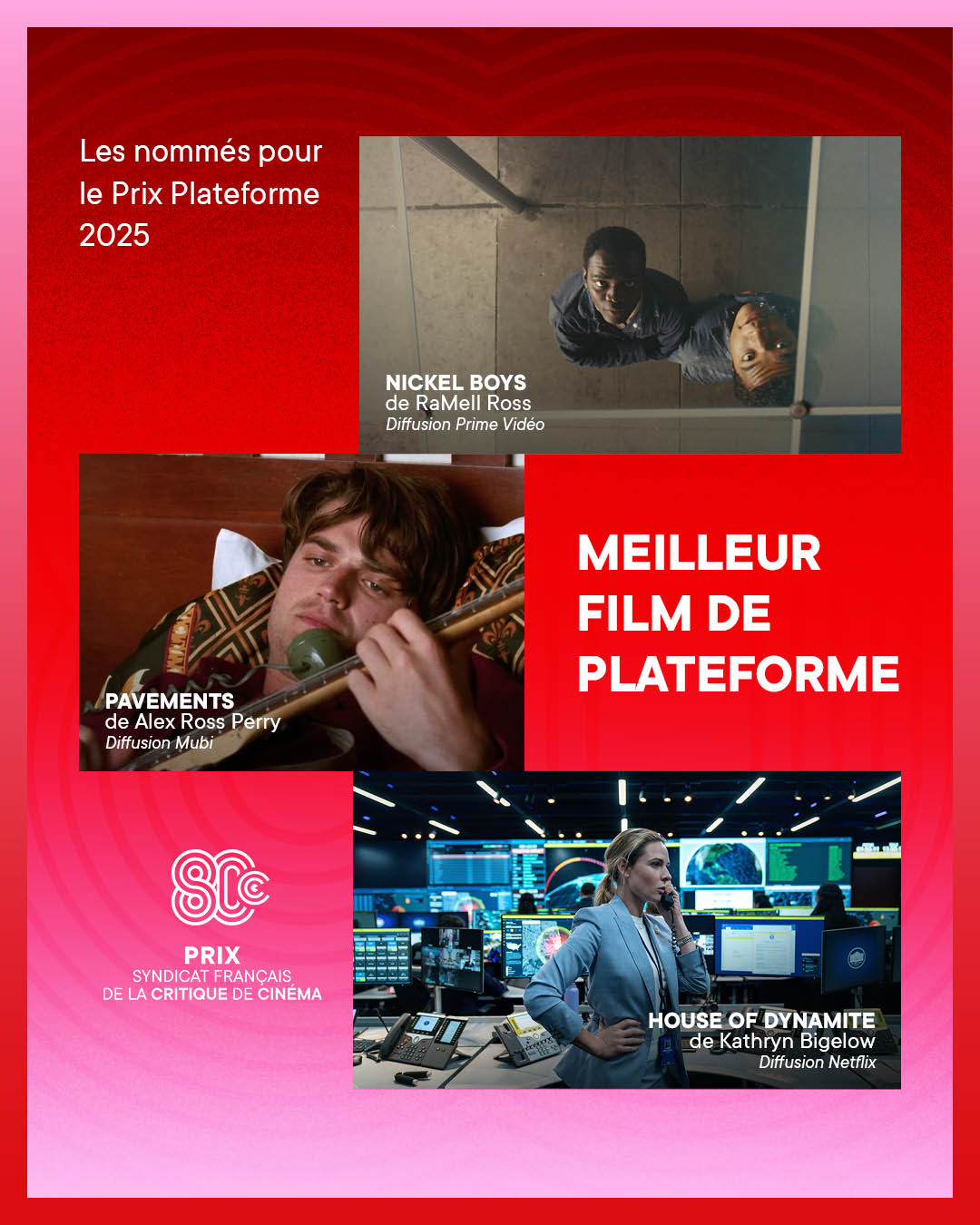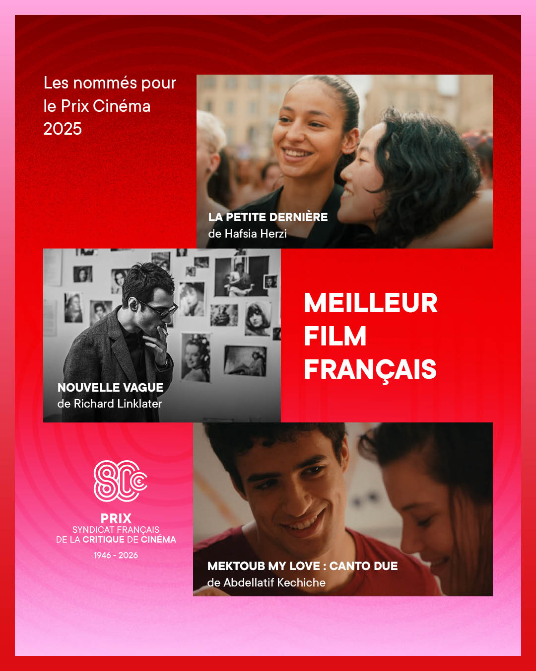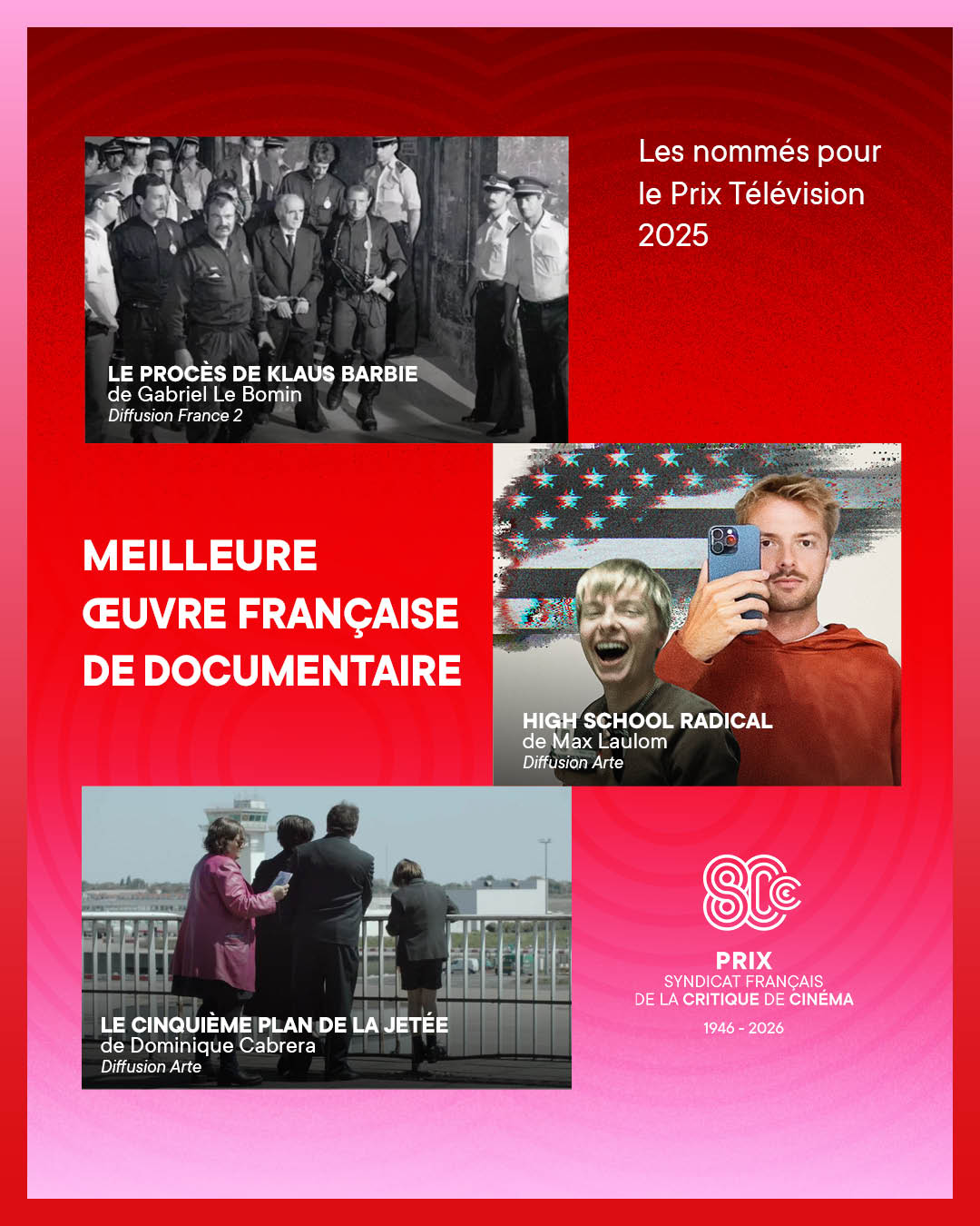 Chaque année, les Prix du Syndicat Français de la Critique de Cinéma et des films de Télévision récompensent le meilleur des ouvrages littéraires et DVDs de cinéma ainsi que les meilleures productions télévisuelles et cinématographiques de l’année.
